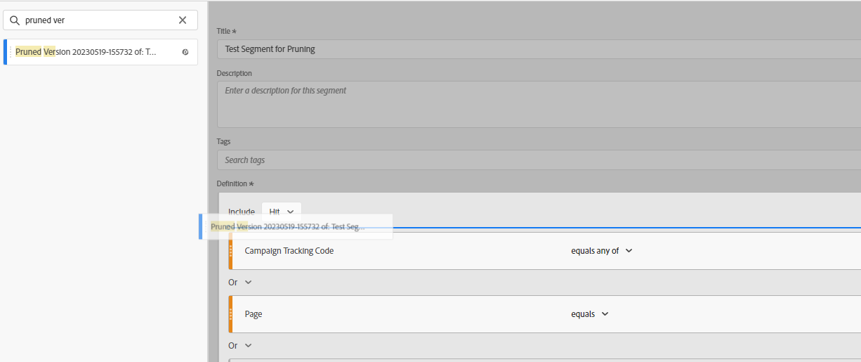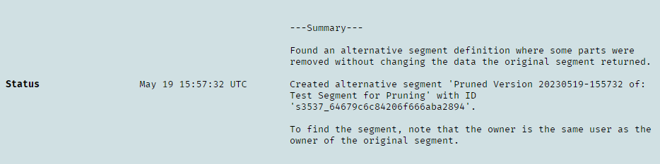 Pruning was possible (see screenshot). The Pruner created an alternative, pruned version of the segment. You can check this version in AA and compare it to the original in a Workspace. Note that the owner of the segment is the same as the owner of the original segment, so if you don't see the segment right away in AA, go to Components -> Segments and then select "Other Filters -> Show All" on the bottom left.