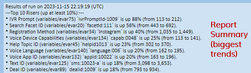 To show as many useful results as possible, the Report Summary contains the values (metrics or dimensional values) with the biggest changes, sorted by change percentage) with the following restrictions: